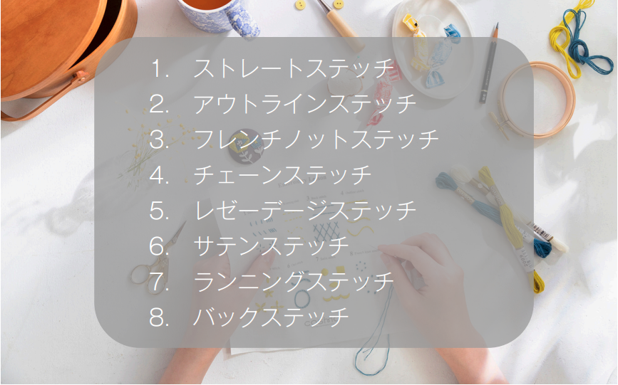 刺しゅう「きほんのステッチ8種類」をご紹介します。